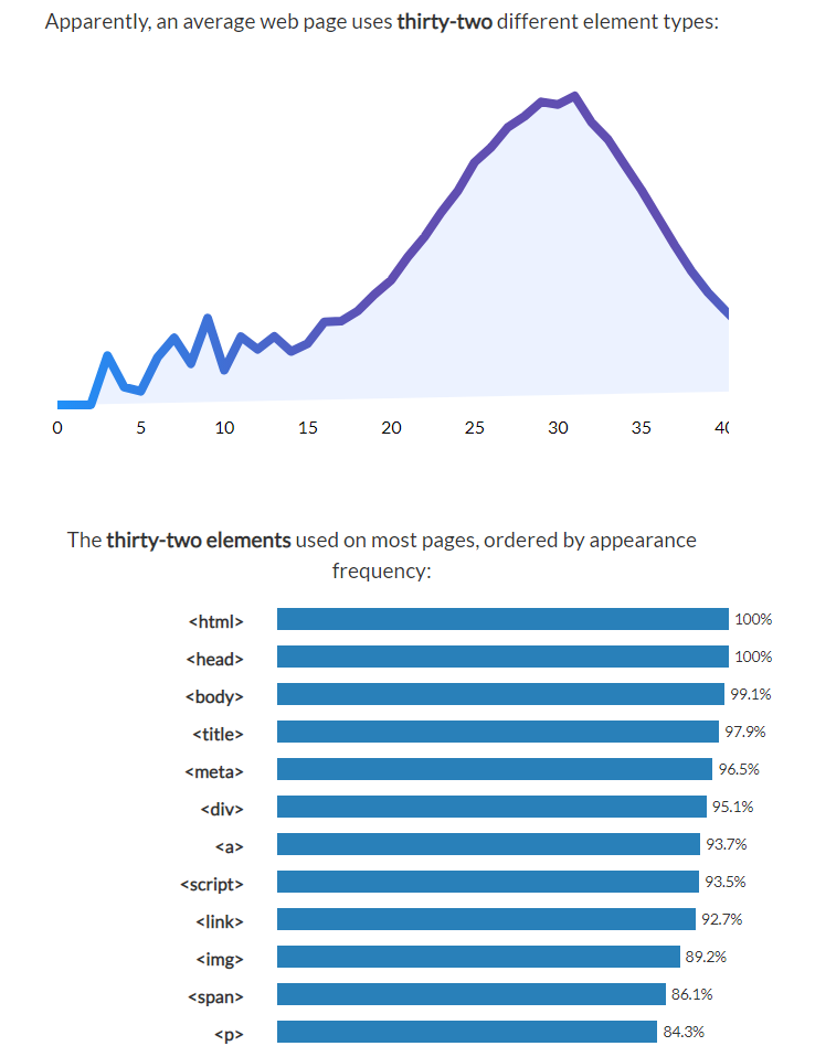 Apparently, an average web page uses thirty-two different element types: The thirty-two elements used on most pages, ordered by appearance frequency: