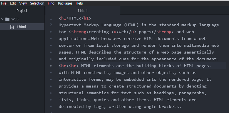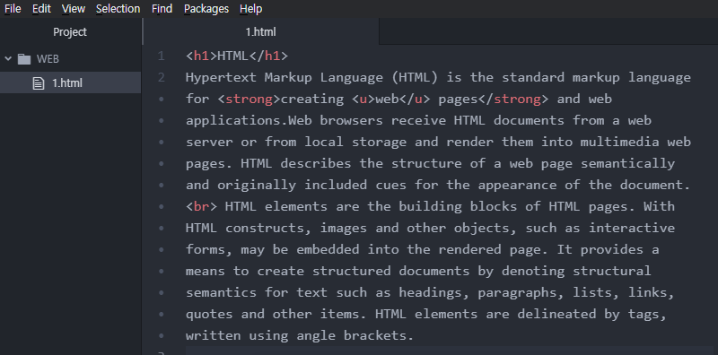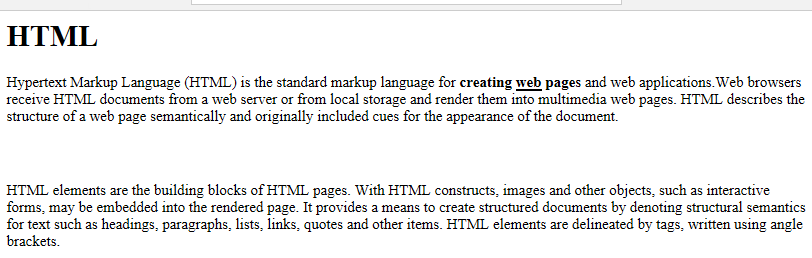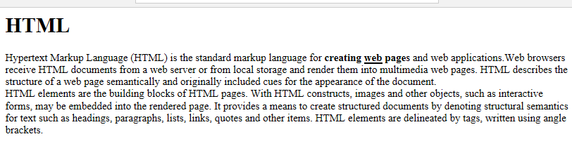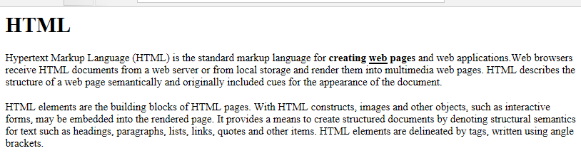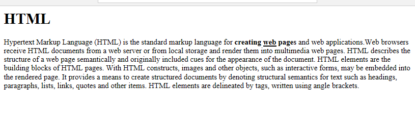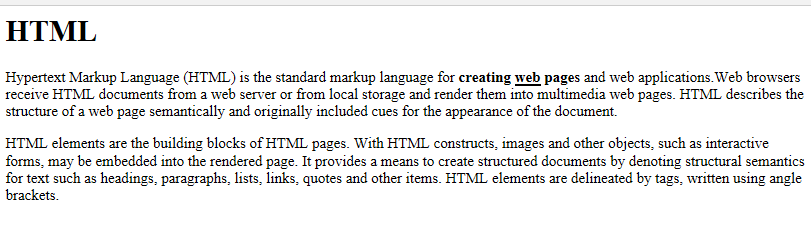Hypertext Markup Language (HTML) is the standard markup language for <strong>creating <u>web</u> pages</strong> and web applications.Web browsers receive HTML documents from a web server or from local storage and render them into multimedia web pages. HTML describes the structure of a web page semantically and originally included cues for the appearance of the document.