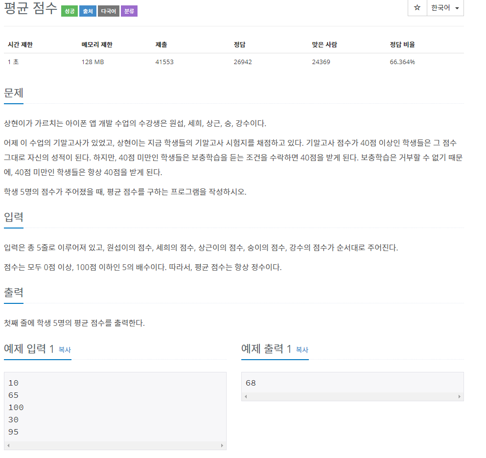 학생 다섯명의 점수를 입력받아 그들의 평균을 구하는 프로그램이다. 단, 점수가 40점 미만인 학생들은 보충수업을 듣는다는 전제하에 점수를 40점으로 가정하여 평균을 구해야 한다. (보충수업은 필수)