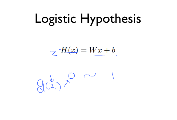 즉, classification에서는 반드시 0과 1의 값만 나타내야 하는데, H(x) = Wx+b의 hypothesis에서는 0보다 훨씬 작거나 1보다 훨씬 큰 값을 나타낼 수도 있게 됨.