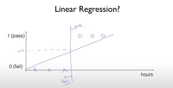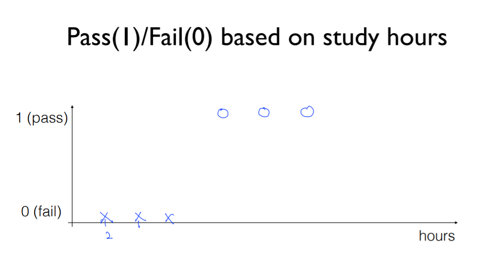 앞에서 배운 linear regression을 적용해보면, 이 데이터를 가장 잘 나타내는 linear한 선을 그린 뒤, 이 선을 통과하면 합격, 통과하지 못하면 불합격이라고 표시하면 될 것 같음.