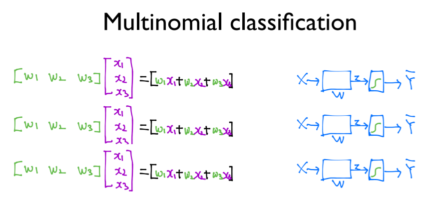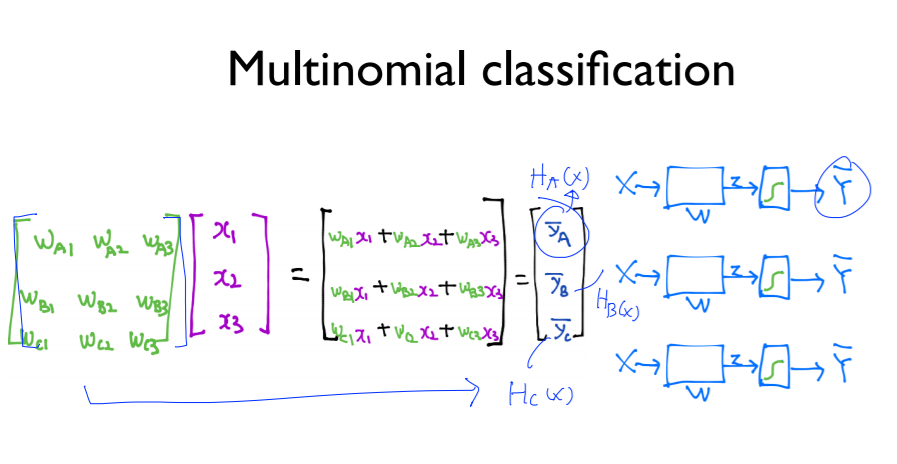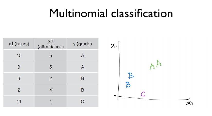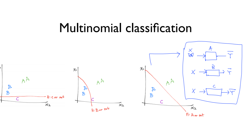 우리가 위에서 배운 binary classification(두개의 class로 구분하는 classification) 으로 A, B, C를 구별할 수 있게 됨.