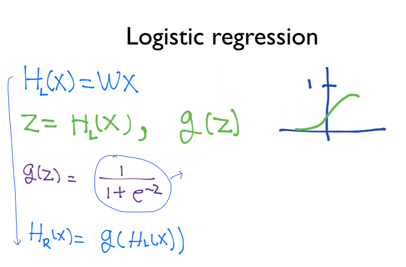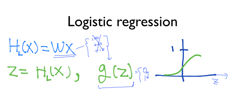 Linear regression이라는 것을 먼저 배웠는데, 여기서 만일 100, 200, -10 등의 큰 값이 주어지게 되면 binary classification에는 적합하지 않았었음. 그래서 이것을 하나의 z라고 두고 g(z)라는 함수에서 압축을 시켜서 0과 1의 사이의 값으로 반환시키는 것을 생각해냄. g(z)의 값이 아주 커져도 1보다는 커지지 않고, g(z)의 값이 아주 작아져도 0보다는 작아지지 않게 됨.