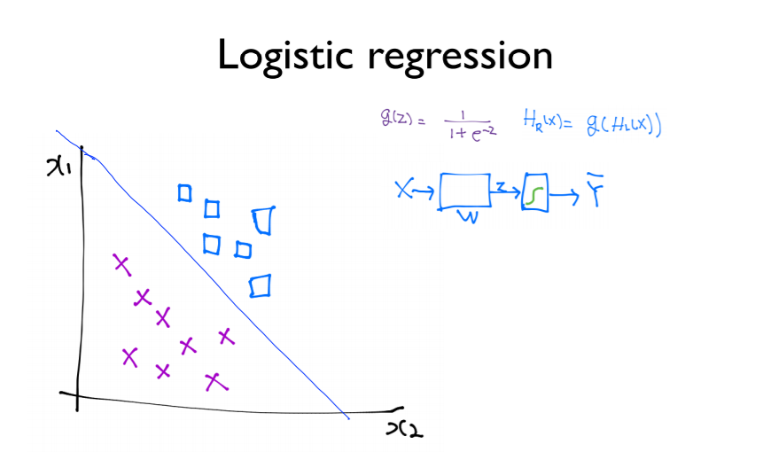 Logistic regression이 하는 일을 직관적으로 살펴보면... x와 ㅁ를 구분하는 선을 찾아내는 것임.
