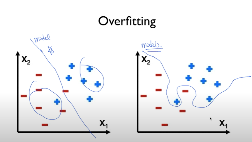 위와 같이 model 1과 model 2 중에서 model 2가 오버피팅이 일어난 경우라고 볼 수 있음. model 2는 현재 데이터셋에 대해서는 아주 잘 들어맞는 모델이지만 실제 use case에는 적절하지 않고 일반적이지 않은 모델임.