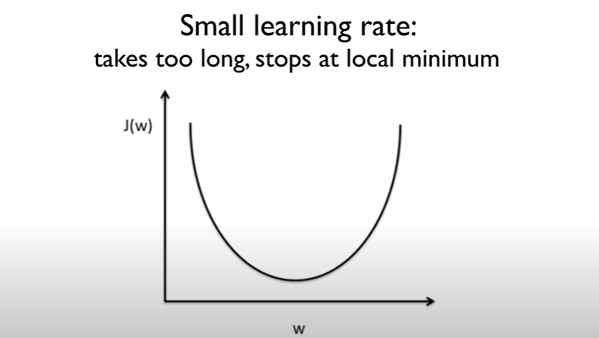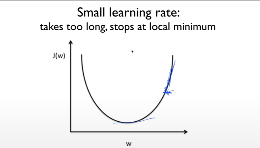 만일 굉장히 작은 값을 learning rate으로 지정해주었다고 가정해보자. 그러면 아주 조금의 스텝 간격으로 내려가게 될 것. 이 때는 train을 모두 마쳤을 경우에 최저점이 아님에도 train을 마쳐버리는 경우가 생길 것.