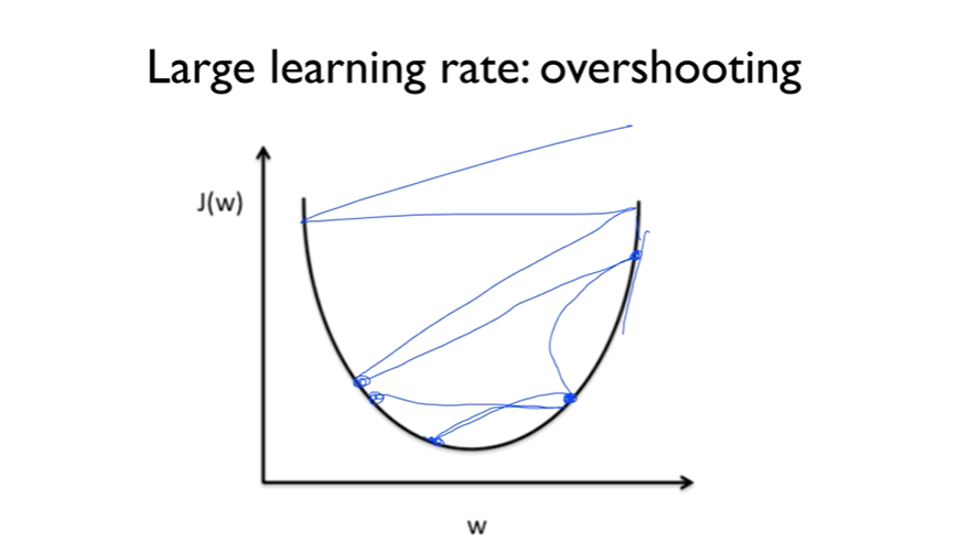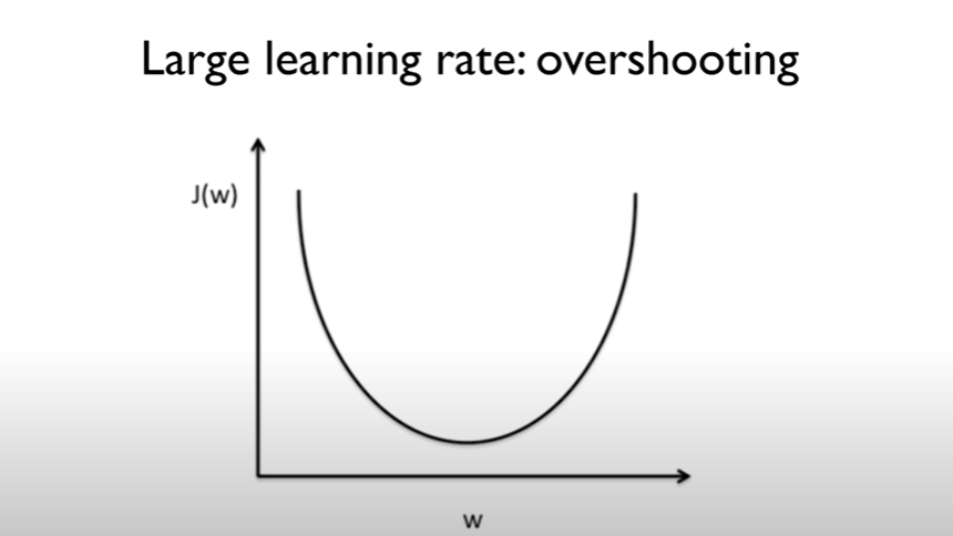 이런식으로 learning rate의 값들을 크게 지정해줬을 때 발생하는 문제를 Overshooting이라고 함.