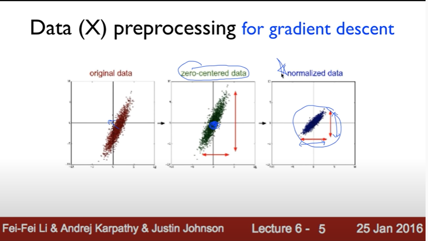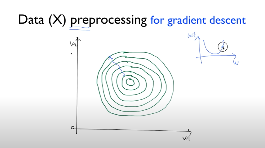우리가 가지고 있는 data x를 선처리해야하는 경우가 가끔 있음. 우리가 가장 많이 사용하는 알고리즘인 gradient descent 알고리즘은 오른쪽의 파란색 그림과 같은데, 이것을 2차원 상으로 표현하게 되면 등고선처럼 초록색 모양으로 나타나게 됨. 우리가 원하는 것은 어떤 점에서 시작할 경우 경사면을 타고 내려가서 최저점에 도착하는 것임.