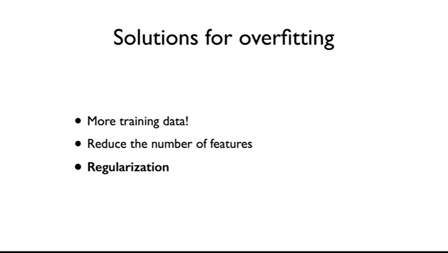 1) 트레이닝하는 데이터의 개수를 아주 많이 늘리거나, 2) 중복되는 feature의 수를 줄이기 위해 삭제하고, 3) 기술적인 방법으로서 regularization시키는 방법이 있음.