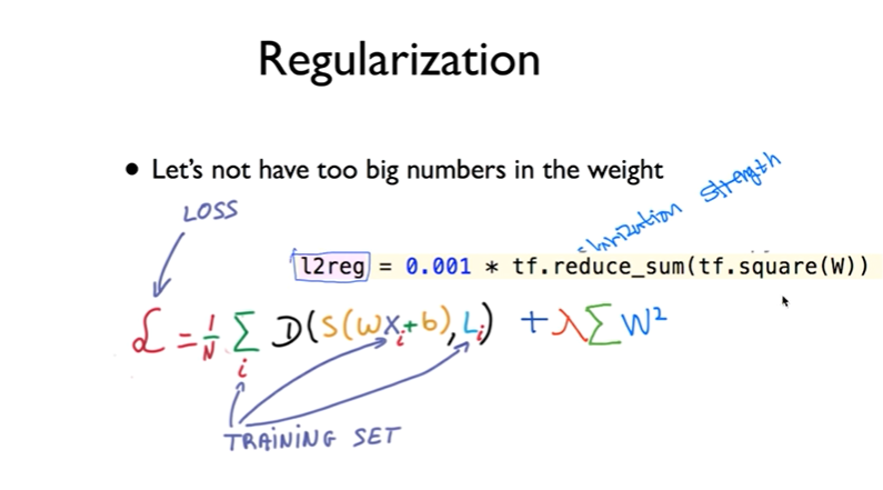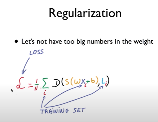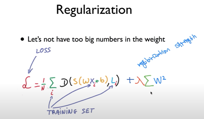 w의 값이 커질수록 그래프의 형태는 구부러진 형태가 되기 때문에, w의 제곱을 sum한 값이 최소화가 되도록 함. 그리고 그 앞에 임의의 람다 값을 곱해주는데 이 값을 regularization strength라고 함. 이 값이 만일 0이 되면 regularization을 하지 않겠다는 의미이며, 이 값이 큰 값이 되면 regularization을 매우 중요하게 생각한다는 의미임.