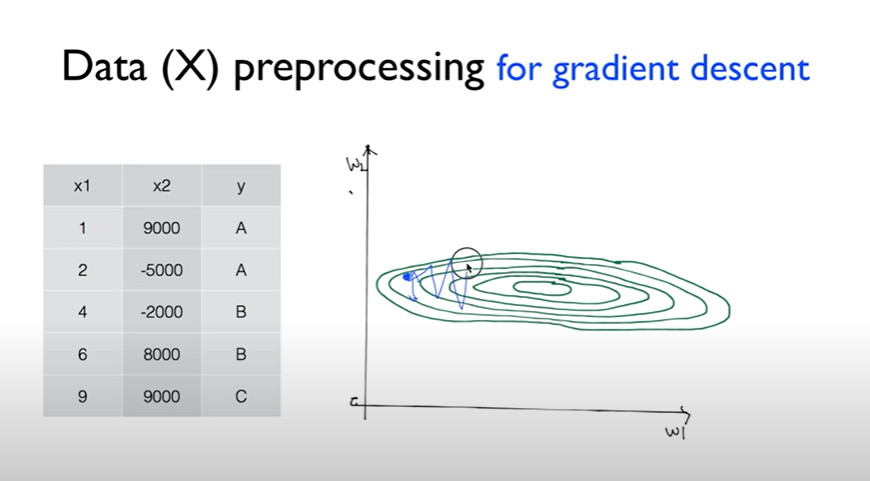 위의 그림과 같이 동그란 모양이 아니라 한쪽으로 치우쳐진 왜곡된 형태의 등고선이 나타날 것. 따라서 적절한 크기의 learning rate 값을 지정한다고 하더라도 등고선 바깥으로 튕겨져나갈 수도 있게 된다. 그래서 이것을 주의해야하며, 이런 경우에는 데이터의 값을 normalize해야함.