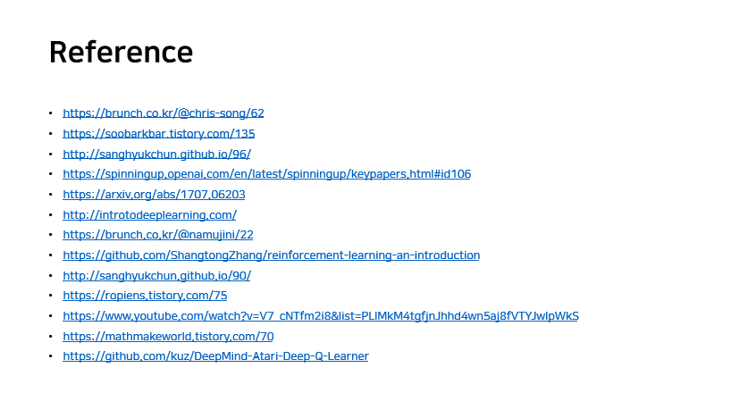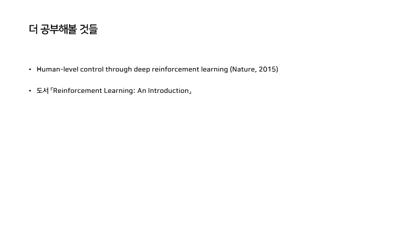 이 논문 이후 Human-level control through deep reinforcement learning이라는 논문도 추가로 읽어보고 싶었는데 시간이 부족해서 아직 공부해보지 못했다. 이 논문 또한 강화학습의 DQN을 다룬 것으로 이번 논문보다 좀 더 구조가 복잡하다는 특징을 가지고 있다.