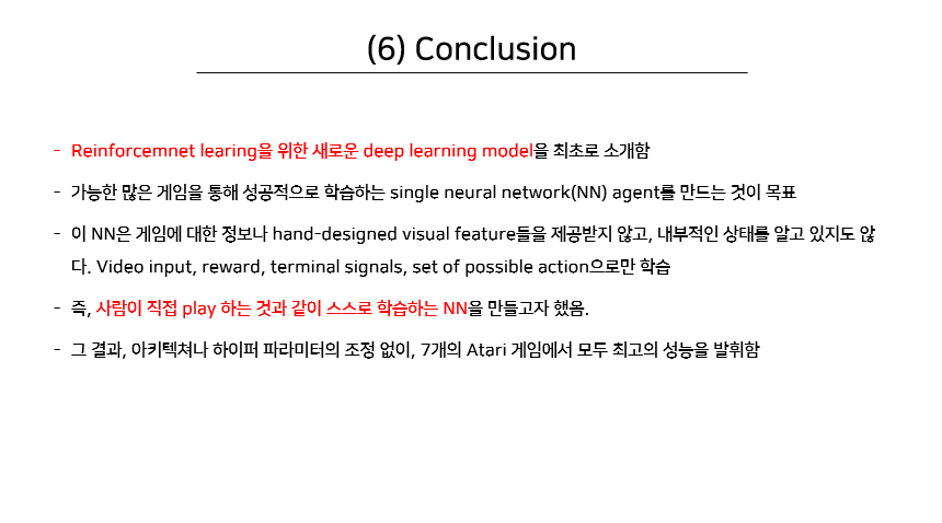 논문에서는 강화학습을 위한 새로운 딥러닝 모델을 최초로 소개했다. 특히 사람이 직접 play하는 것처럼 스스로 학습하는 네트워크를 만들고자 했으며, 이 네트워크는 아키텍쳐나 하이퍼 파라미터 조정 없이 7개의 게임에서 모두 최고의 성능을 발휘함으로써 성공한 결과를 보이고 있다.