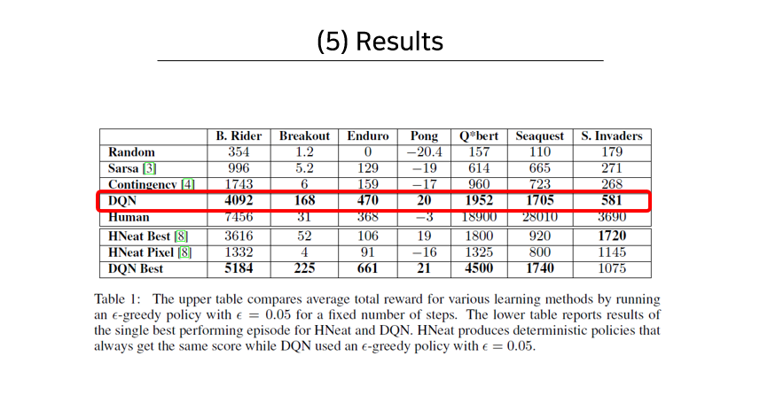 위의 모델을 가지고 딥마인드 팀에서 실험한 결과를 보여주는 표다. 빨간색 박스로 표시한 부분이 딥마인드에서 제시한 DQN 모델에 대한 결과이며, 다른 모델을 사용하거나 사람이 직접 했을 때보다 상당히 높은 값을 얻은 것을 볼 수 있다.