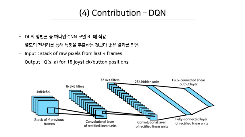 4개 화면의 프레임이 raw pixel로서 input 데이터로 사용되며, output은 input state에 대한 개별 action의 예측한 Q-value에 해당한다. 이 모델을 통해 별도의 전처리를 통해 특징을 추출하는 것보다 좋은 결과를 얻을 수 있게 된다.