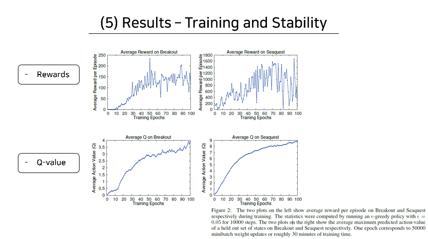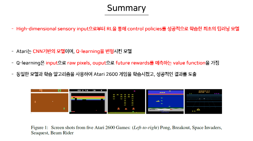 이 모델은 CNN을 기반으로 해서 Q-러닝을 변형시킨 형태의 모델이다. 또 이 모델을 가지고 직접 Atari 게임을 여러 차례 돌려봤을 때 모델의 조정이나 하이퍼 파라미터의 조정 없이 게임에서 성공적인 결과를 이끌어냄으로써 딥러닝을 적용한 강화학습이 잘 된 것을 보이고 있다.
