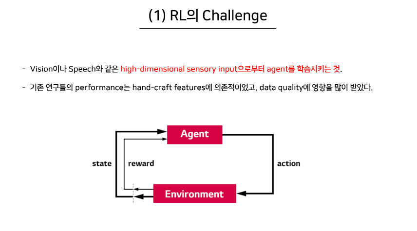 우선 강화학습의 경우, 이 논문이 발표되기 전에는 음성이나 이미지와 같은 고차원의 sensory input에서는 에이전트를 학습시키기 어려웠다고 한다. 또한, 당시의 연구들은 사람이 직접 조정한 hand-craft feature에 많이 의존적이었으며, 이 때문에 data quality도 많은 영향을 받았다고 한다.
