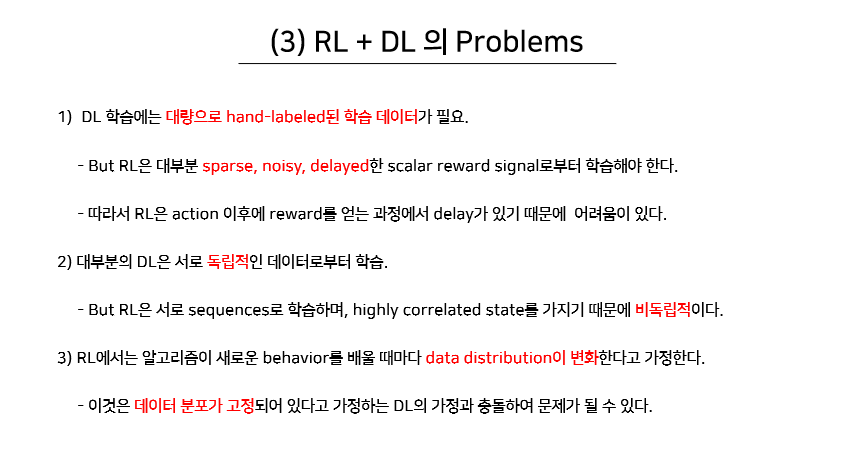 그런데 강화학습과 딥러닝은 서로 다른 특성 때문에 바로 결합하기가 어렵다.
