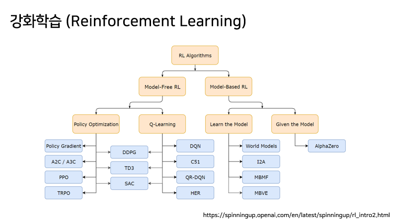 강화학습은 크게 위와 같이 분야가 나누어볼 수 있다. 그 중에서도 크게 Model-Free와 Model-Based 2가지로 나뉘는데, 그 중에서도 강화학습의 기초에 대해 배우려면 DQN을 먼저 공부하는 것이 좋다고 하여 이를 먼저 공부하게 되었다.