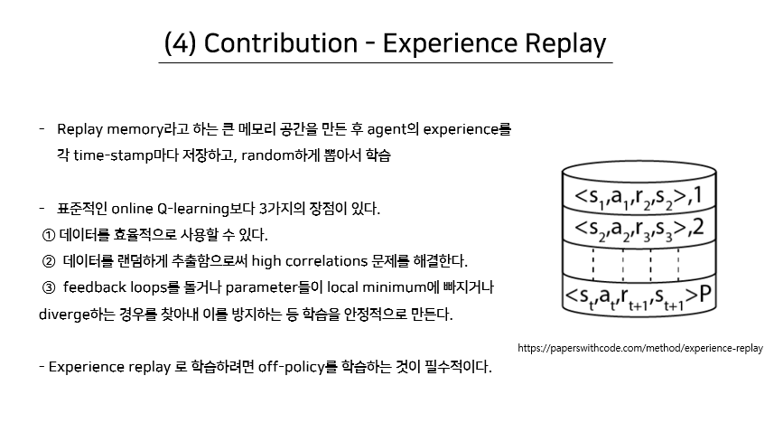 우선 강화학습의 데이터가 High-correlation의 관계를 가진다는 점을 극복하기 위해 Experience replay를 제안한다.