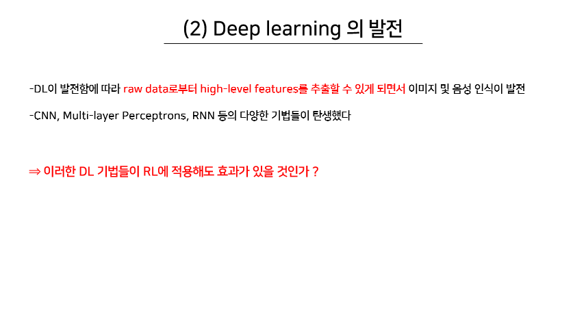 이러한 두 가지 배경에서, 딥마인드 팀에서는 "과연 딥러닝 기술을 강화학습에 적용해도 효과가 있을것인가?" 라는 질문을 던지게 된다.
