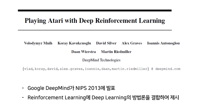 이번에 공부하기 위해 선정하게 된 논문이 Playing Atrai with Deep reinforcement learning이다. 이 논문은 2016년 알파고를 개발한 구글의 딥마인드 팀에서 NIPS 2013년에 발표한 논문이며, 여기서 내용을 좀 더 보강하여 2015년에 네이처에 기고했다고 한다. 이 논문은 최초로 강화학습에 딥러닝의 방법론을 결합하여 제시한 논문으로서 의의가 있다.