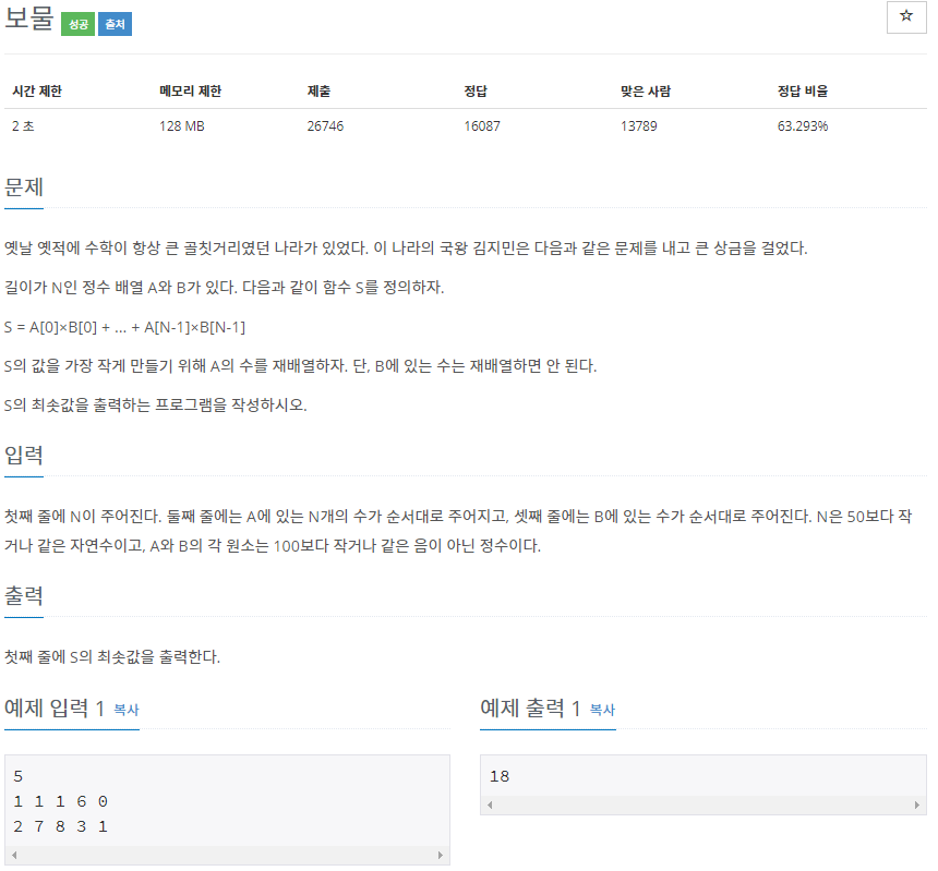첫째 줄에 N이 주어진다. 둘째 줄에는 A에 있는 N개의 수가 순서대로 주어지고, 셋째 줄에는 B에 있는 수가 순서대로 주어진다. N은 50보다 작거나 같은 자연수이고, A와 B의 각 원소는 100보다 작거