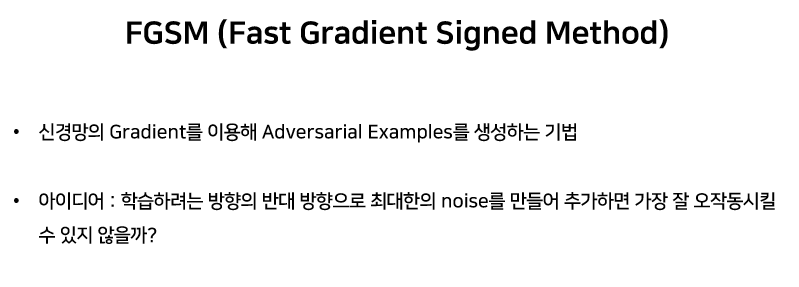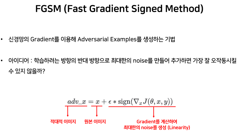 FGSM은 빠르고 간단하게 Adversarial Examples를 생성하는 기법이며, Gradient를 이용해서 생성하는 기법이다. 이 기법은 학습하려는 방향의 반대 방향으로 최대한의 노이즈를 만들어서 기존 데이터에 합하면 가장 잘 오작동시킬 수 있지 않을까? 라는 아이디어에서 시작되었다.
