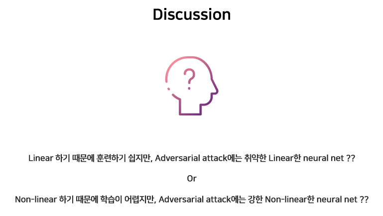 논문 intro 후반에서는 위와 같은 고민을 언급한다. Adversarial 공격에는 취약하지만, Linear하기 때문에 훈련이 쉬운 Linear Neural Net을 개발할 것인지, 아니면 공격에는 강하지만, Non-Linear하기 때문에 학습이 어려운 Non-Linear Net를 개발할 것인지에 대한 고민이다.