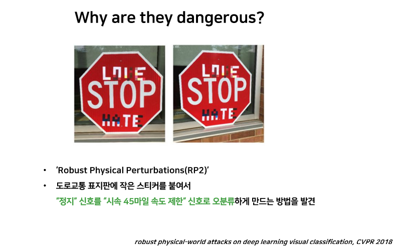 위의 사진은 원래 STOP이라는 글씨가 적혀 있었던 정지 신호 표지판이다. 하지만 위와 같이 작은 스티커를 몇 개 붙이게 되면 자율주행차량은 이를 시속 45마일 속도 제한이라고 인식하게 된다. 만일 자율주행차량이 Adversarial attack에 노출되어서 이처럼 표지판 인식에 오류가 생긴다면, 이는 사람의 목숨과도 직결되기 때문에 Adversarial attack에 대한 problem을 해결하는 것은 중요한 문제이다.