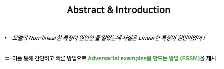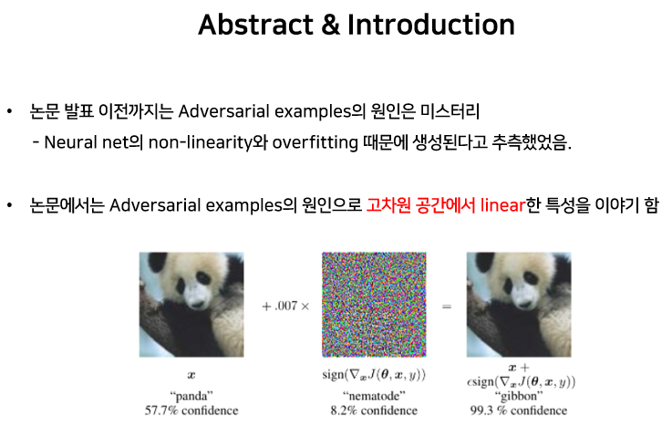 이 논문에서는 Adversarial Examples의 원인을 설명하고, Adversarial examples를 만드는 기법 중 하나인 FGSM을 소개하고 있다.