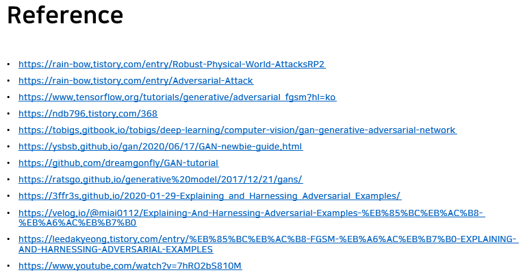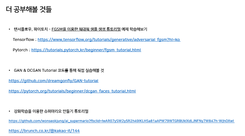 다음으로는 이번 발표 이후 더 공부해보고 싶은 부분들을 정리해봤다. 우선 오늘 다룬 적대적 공격에 대한 자료로 FGSM을 이용해서 직접 적대적 샘플들을 생성해볼 수 있는 튜토리얼을 찾았는데, 텐서플로우와 파이토치 모두 튜토리얼이 있어 각각 실습해보면 좋을 것 같다.