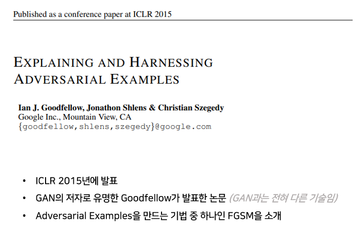 이 논문은 ICLR에서 2015년에 발표된 논문으로, 지난 게시글에서 다룬 GAN 논문 저자로 유명한 Goodfellow가 발표했다. 이 때, GAN과 Adversarial attack 모두 Adversarial이라는 단어가 들어가지만 둘은 전혀 다른 기술이다.