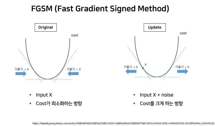 그림으로는 위와 같이 확인해볼 수 있다. 왼쪽과 같이 원래는 Cost값, 즉 오차를 최소화할 수 있는 방향으로 움직인다. 하지만 FGSM을 통해 노이즈를 추가하여 업데이트된 상황을 살펴보면 오히려 Cost값을 크게 하는 방향으로 진행된다. 이 방식을 통해 Adversarial Examples를 간단하게 생성할 수 있게 되는 것이다.