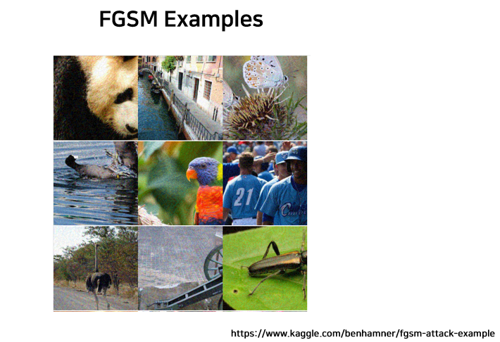 이 사진들은 FGSM 기법으로 만들어진 Adversarial Example 들이다. 이 사진들의 경우, 자세히 보면 노이즈가 낀 것을 육안으로도 확인해볼 수 있다.