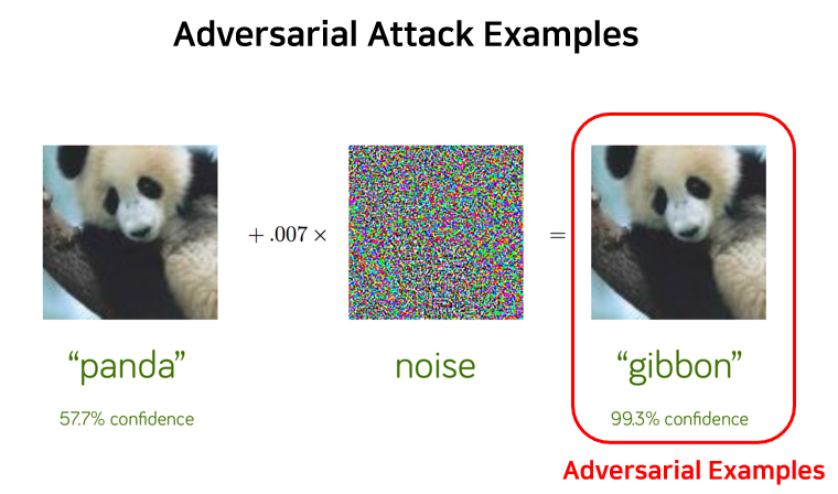 이 때 오른쪽 사진과 같이 노이즈가 포함된 이미지들을 Adversarial Examples라고 부른다. 사람이 보기에는 원래의 사진과 구별하기 어렵지만, 기계가 인식했을 때는 다른 사진으로 구별해서 인식한다는 특징이 있다.