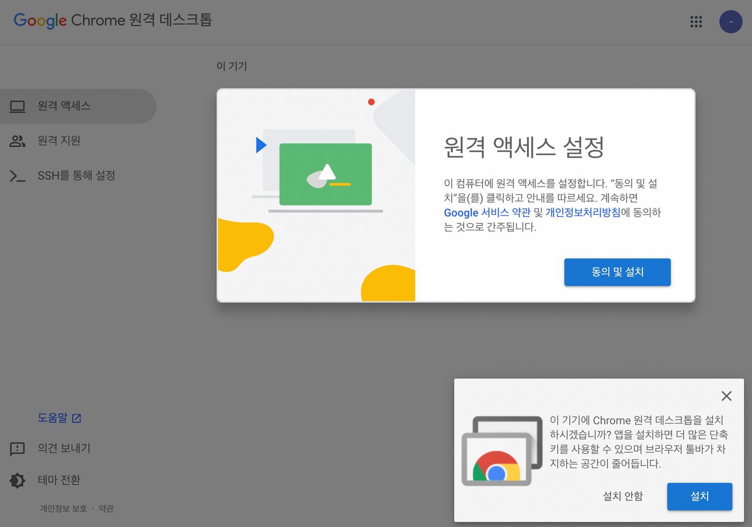 3) 원격 액세스 설정에서 '동의 및 설치' 클릭