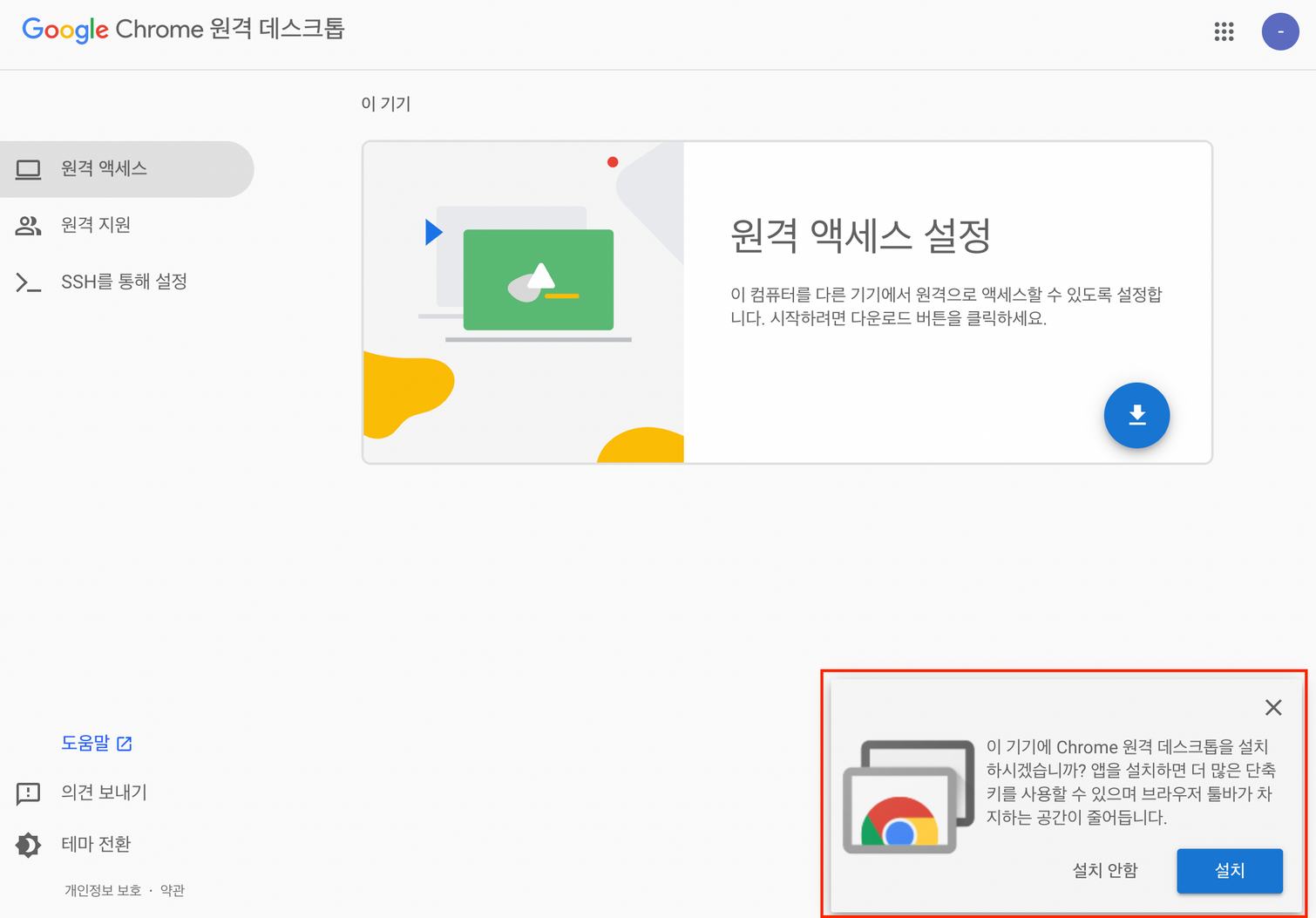 - 오른쪽 하단의 설치 버튼 눌러서 chrome remote desktop extension 설치