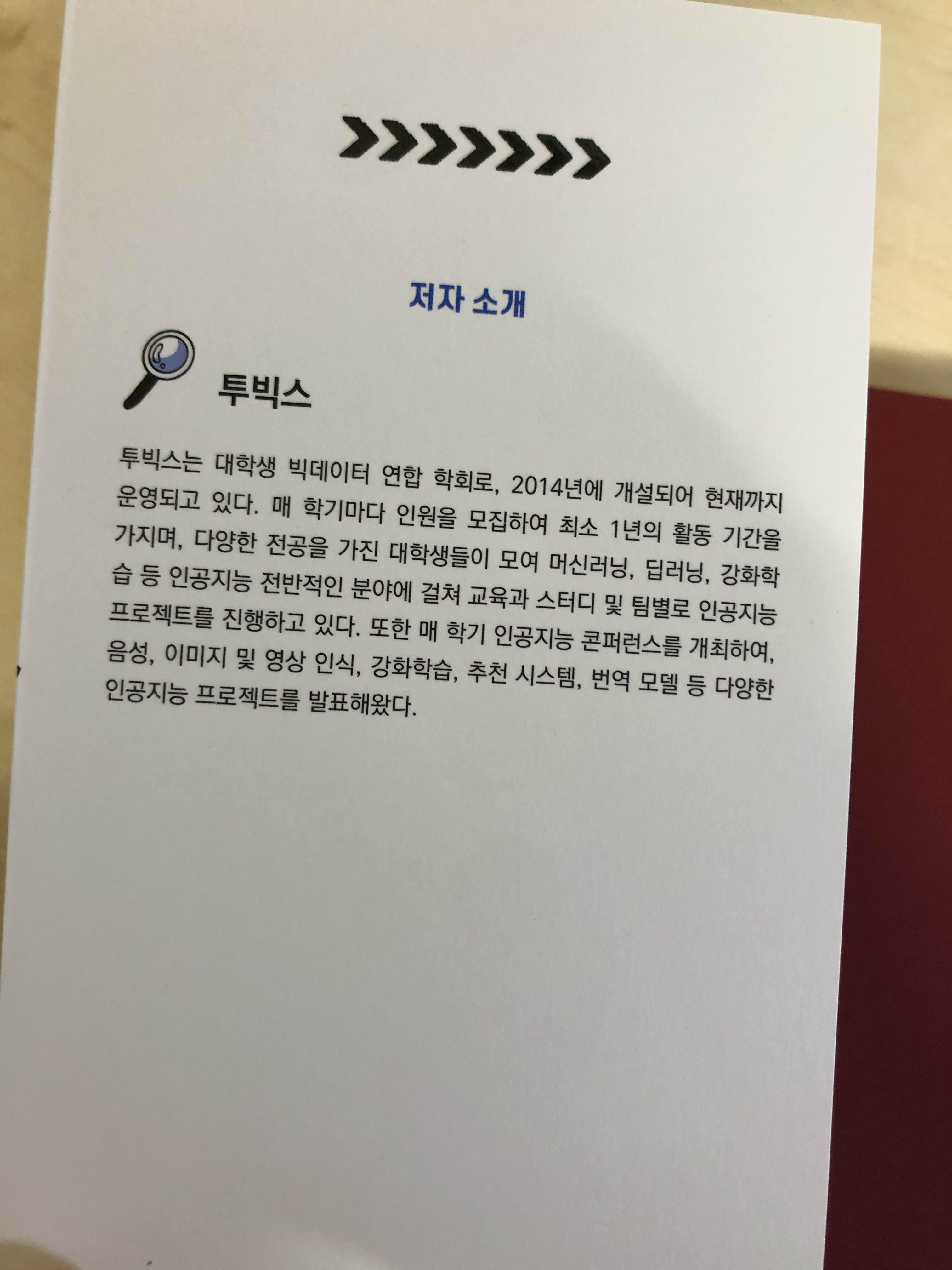 책을 보기 전, 가장 인상 깊은 것은 바로 저자에 대한 정보였다. 예전에 익히 들어 알고 있었던 빅데이터 연합 학회인 '투빅스'가 바로 이 책의 저자이다. 나와 같은 신분의 대학생들이 모여 직접 인공지능에 대한 공부를 하며 배웠던 내용들을 모아 책으로 출간해서 그런지 왠지 신뢰가 갔고, 읽어보고 싶은 마음이 막 생겼다. 왠지 나와 비슷한 고민을 했을 것 같고, 비슷한 어려움을 겪었을 것 같아 그런 부분을 잘 녹여낸 책이 아닐까 싶어 기대가 됐다.