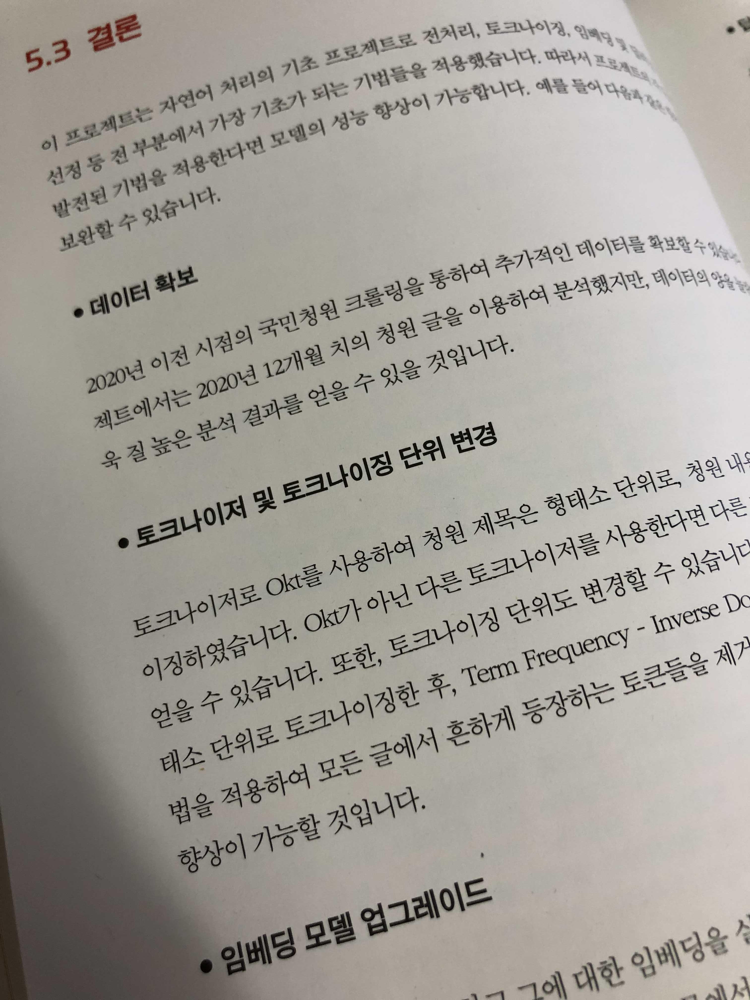 실습 파트 중에서도 특히 Part5. 국민청원 분류하기 와 Part7. 실시간 비명 감지 시스템 파트를 좀 더 유심히 봤다. 아무래도 지금 졸업프로젝트에서 음성기반+텍스트 기반의 멀티모달 감정분류 모델을 개발하고 있어서 눈이 좀 더 가게 된 것 같다. 특히 개인적으로 NLP 모델을 처음 구현했을 때 어떤 순서대로 진행하는 건지 흐름을 제대로 못잡아서 어려움을 겪은 적 있는데, 이 책에서는 결론 파트에서 전체적인 코드 구현의 순서에 대해 다시 정리를 해주어서 넓은 시야에서 다시 정리해볼 수 있어좋았다.
