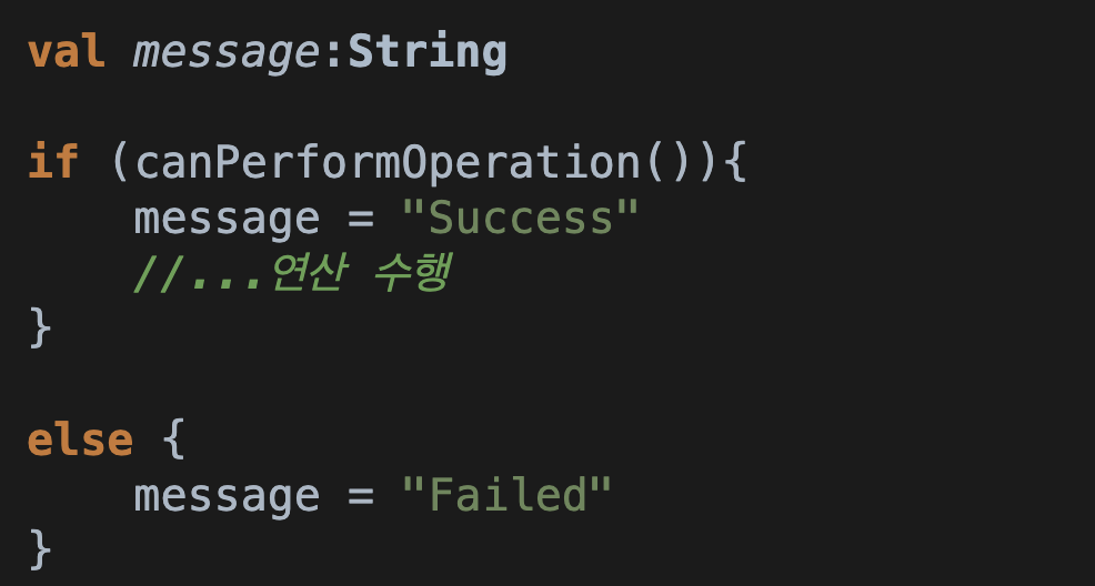val 변수는 블록 실행 시 정확히 한 번만 초기화해야 한다. but 어떤 블록이 실행될 때 오직 한 초기화 문장만 실행됨을 컴파일러가 확인할 수 있다면 조건에 따라 val 값을 다른 여러 값으로 초기화 가능하다. 아래 예시 코드.
