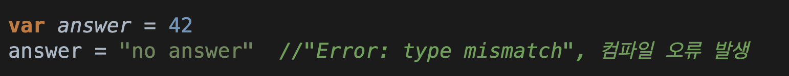 var 키워드 사용하면 변수 값 변경 가능하지만, 변수 타입은 고정되어 바뀌지 않음. 아래 예시 코드.