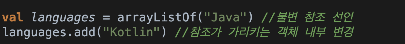 val 참조 자체는 불변이지만, 그 참조가 가리키는 객체의 내부 값은 변경될 수 있다. 아래 예시 코드.