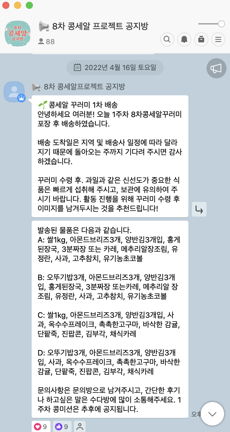 다음 2주차에는 어떤 식품 꾸러미들이 배송될 지 벌써 기대가 됩니다~~ 다음 포스팅에서 소개할게요!